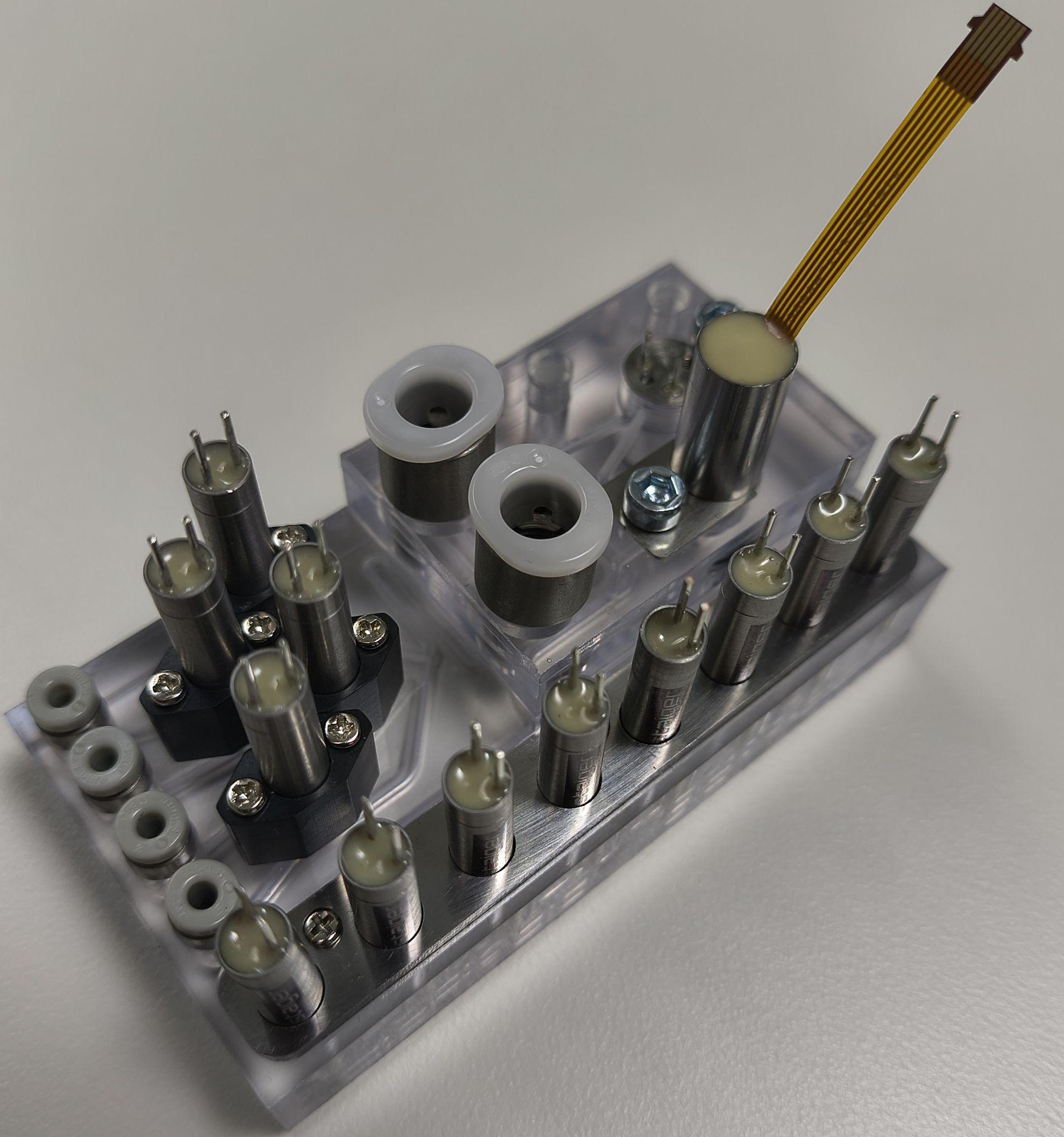 This specific 4-layer manifold contains a variety of valves from Staiger GmbH, included their 5mm diameter 2-way media-separated valves for liquids